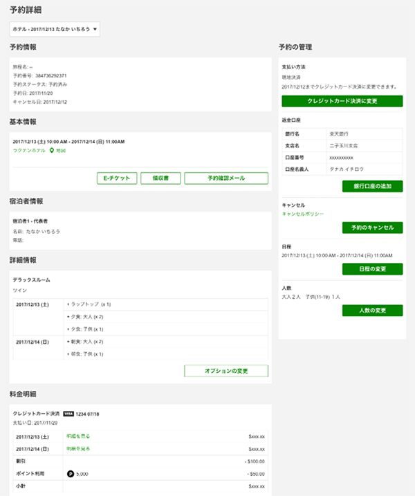 こちらもマイページ内のいち画面。決済方法や銀行口座、キャンセルポリシー、日程、人数などを一覧で表示。必要情報をまとめて確認でき、変更も簡単にできるようになる