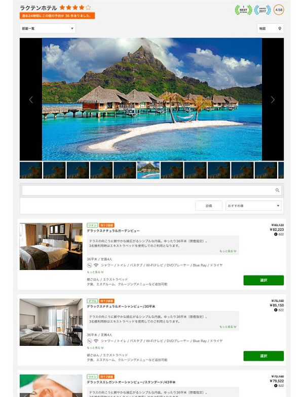 地名などで検索後、宿泊施設を選択すると、まずは部屋のリストが出てくる