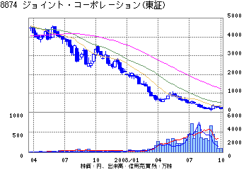 ジョイントは01年3月に東証1部に上場したが、当初はマンション分譲会社だった。ところが、06年3月期になると突如、セグメントに「不動産流動化事業」が顔を出し、今年5月発表の08年3月期には売上高1877億円のうち流動化事業1161億円、マンション分譲557億円と不動産流動化事業が主力になった。が、流動化事業の環境が急変。5月には、向こう2年間で棚卸し資産を1000億円圧縮し、同時に有利子負債も1000億円削減すると発表した。しかし、市場の反応は悪く、株価は当時の1060円から9月3日には103円にまで暴落。そんな状況下で、先述の資本参加が発表された。