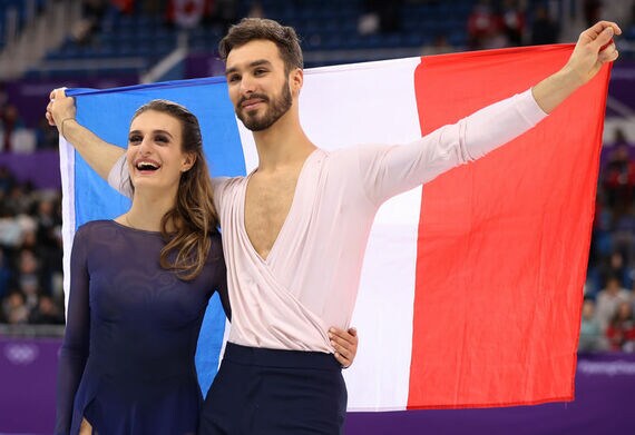 2月20日、平昌冬季五輪のフィギュアスケート・アイスダンスに出場している女性選手たちは、衣装のトラブルを避けるためにテープやのりを使用して競技に臨んだ。写真右は衣装がはだける事故を乗り越え、銀メダルを獲得したフランスのガブリエラ・パパダキス(2018年 ロイター/Phil Noble)