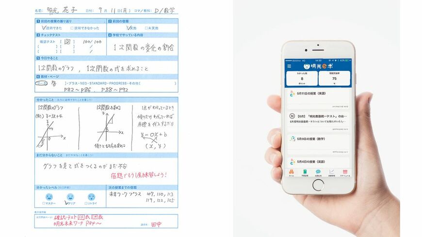 「振り返りノート」の画像や授業の理解度は、「明光eポ」に登録する。これは、学びのプロセスを蓄積するためのeポートフォリオで、生徒自身や講師はもちろん、保護者もスマートフォンなどのアプリを通して、わが子の学習の様子を知ることができる。