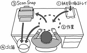 書類は使い終わったならばScanSnapのようなドキュメントスキャナーを利用してデジタル化し、原本を保管するか廃棄します。書籍や小物も、机の上に滞在することができる期限を設定して、読み終わったものは書庫に、使い終わったものは捨てるといったフローを設定しておくわけです。机の上を「保管場所」にせず、「情報が流れていく空間」として意識します。