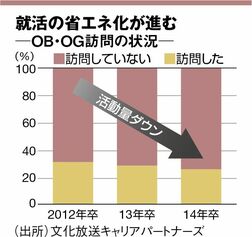 冒頭の例のように、就活への第一歩となる3年生向け就職ガイダンスの参加率は、多くの大学で下がりつつある。企業にエントリーシートを提出する数、OB・OG訪問に行った人の割合も漸減している。就活生の活動量が減り、省エネ化が進んでいるのだ。