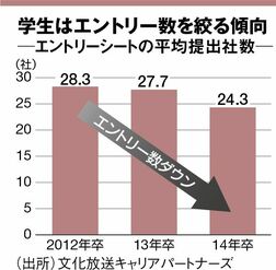 今年6月、都内のある私立大学で行われた3年生(2015年卒)向け第1回の就職ガイダンス。例年2000人ほどの参加者がいるが、今年は1450人程度と、3割も減ってしまった。