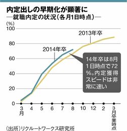 内定出しのスピードは実際、非常に速くなっている。14年卒(今の4年生)の内定率は、8月1日時点で72%。これは前年を6%も上回る。