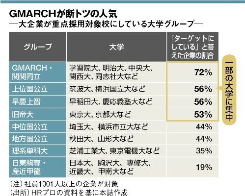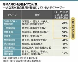 重点採用校は一部の上位校に限られる。最もターゲットされているのが、GMARCH(学習院大、明治大、青山学院大、立教大、中央大、法政大)だ。学生数も多く、大企業からも中小企業からも人気が高い。