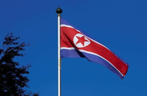 2月27日、外務省は、北朝鮮船籍のタンカーが、国連の制裁決議に違反して他の船と洋上で物資を引き渡す「瀬取り」をしていた疑いがあると発表した。写真は北朝鮮の国旗。2014年10月撮影(2018年 ロイター/Denis Balibouse)