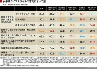 しかし、女子の場合、共働き志向と専業主婦志向で、「将来持つであろう家庭」を重視する割合が高く、「自分の収入のみで生活する」と回答した女子は、「自分のキャリア・仕事」や「収入・家計」の割合が高い傾向にある。