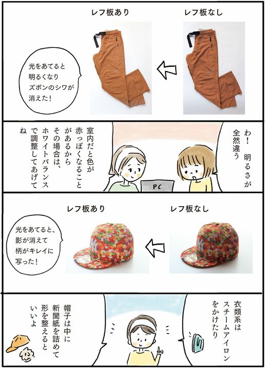 影になっている部分に、白い紙をレフ板代わりにして光をあててあげましょう。ズボンのシワが目立たなくなったり、柄を綺麗に見せたりする効果があります。