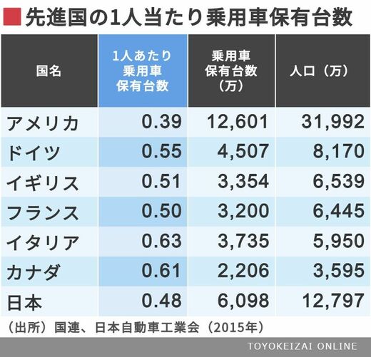 日本は人口1億2797万人に対し、乗用車保有台数は6098万台と1人当たり0.48台となる。アメリカは同0.39台、ドイツ、イギリス、フランス、イタリアといった欧州主要国とカナダは同0.50~0.63台の間だ。現在、先進国では自動車販売が限界を迎えているといわれるが、ここで見ると人口1人当たり乗用車保有台数の限界は0.5~0.6台と考えていいだろう。