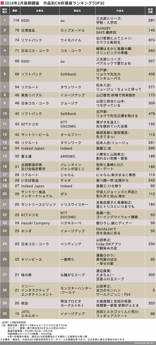 KDDI『au』を筆頭に人気タレントが登場する定番シリーズが上位に並ぶ中、2月後期に放送された全3018作品の中でCM好感度トップ30にランクインした。