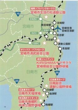 宮崎県では、宮崎市、日南市、西都市でプロ野球キャンプが行われている。宮崎市ではソフトバンクホークス、オリックス・バファローズ、巨人の3球団がキャンプを行っている。1つの市町村で、3球団がキャンプを張っているのは宮崎市だけだ。