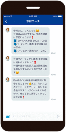 期間中は、コーチにその日の学習内容を毎日チャットで報告。コーチからも具体的なアドバイスや励ましの言葉がすぐに返ってくるから、戒めと同時に励みにもなる。「勉強内容の報告とともに、その日の出来事や感想などを一言書いていただいています。またそれに返信するのも楽しみです。一人ひとりとしっかりつながって、緊張感あるコミュニケーションをとれている実感がありますね」(山道さん)。挫折しにくさの秘訣は、この密な関係性にもあるようだ。