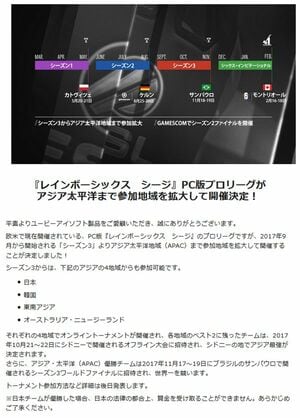 昨年6月に掲載されたその告知にはPC版『レインボーシックス シージ』のプロリーグ「シーズン3」がアジア太平洋地域まで参加地域を拡大して開催すると書いてあります。