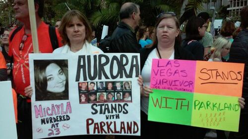 彼女の横には、コロラド州アローラの映画館の乱射事件で、23歳の従姉妹を亡くしたという女性、アニタ・ブッシュが立っていた。手には殺された従姉妹、マケイラ・メディックが微笑んでいる写真を持っている。