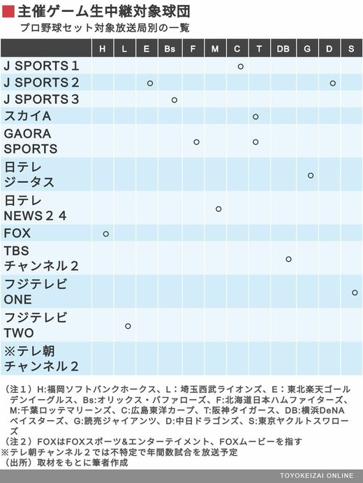 例外はGAORAだ。北海道日本ハムファイターズと阪神タイガース、2チームの主催ゲームを放送しているが、日ハム戦は主催全試合を中継しているので、阪神戦はスカイAと分け合っている。