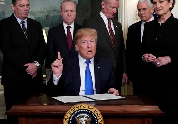 3月28日、「賭け」を生業とする米ウォール街の金融マネジャーたちにとって、トランプ米大統領の通商面での対中強硬姿勢は、高額な賭け金がかかったポーカーの手のように見えている。写真はホワイトハウス22日、中国が米国の知的財産権を侵害しているとして最大600億ドルの輸入品への課税方針を署名するトランプ米大統領(2018年 ロイター/Jonathan Ernst)
