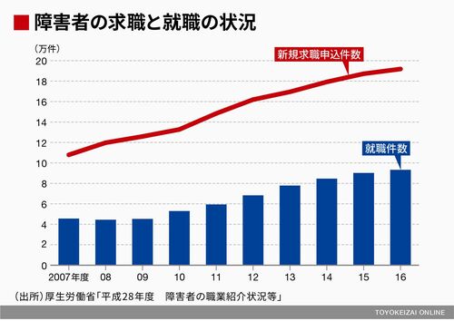障害者の就労は、近年急速に増えている。2016年度にハローワークに新規で求職の申し込みをした障害者の数は19万1853件、ハローワークを通じた障害者の就職件数は9万3229件に上り、過去最高だ。また、就職率(就職件数/新規求職申込件数)も48.6%と8年連続で上昇している。
