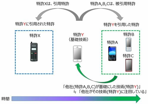 そもそも、新技術の大半が既存技術を基礎とする「組み合せ」であり、その組み合せに利用された技術、言い換えるなら他社に引用される技術は、まさに「基礎技術」といえる。すなわち、「他社が基礎にした技術(≒特許)」を見ることで「他社がその技術(≒特許)に注目している」かどうかを確認することが可能となる。