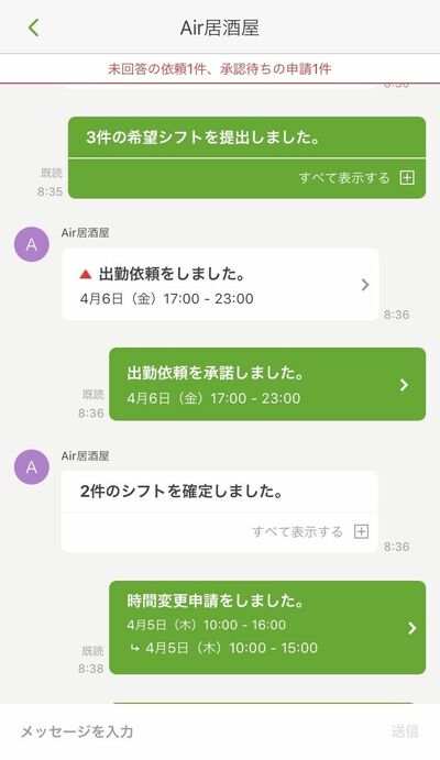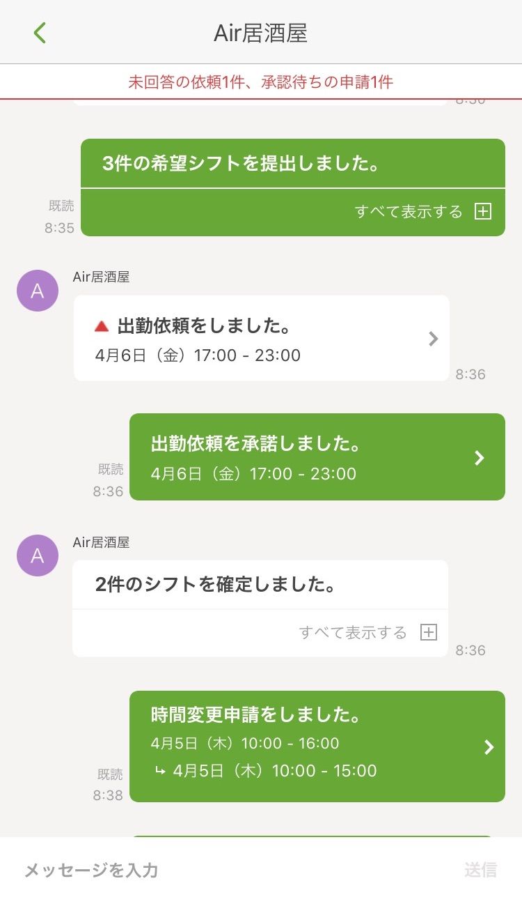 『シフトボード』アプリ内のメッセージ画面