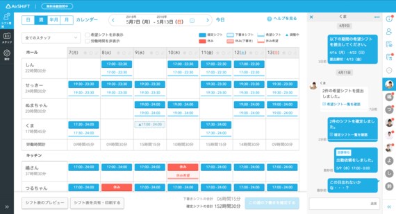 Airシフトは、スタッフとチャットベースのやり取りができる。たとえばチャットでシフトを打診して、スタッフが「OK」と押せば、シフト表に自動かつリアルタイムに反映される。シフトの希望を集めてシフト表に書き写す作業がなくなるので、店長の負担が大幅に軽くなるだけでなく、転記の際に起こりがちだった写し間違いや抜け漏れもなくなる。