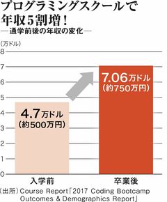 それでも入学者が絶えない背景には、年収の伸びへの期待がある。これまでにブートキャンプを卒業した人の平均年収は、入学直前の仕事で4.7万ドル(約500万円)。それが卒業後に得た仕事では7万ドル(約750万円)に上昇している。