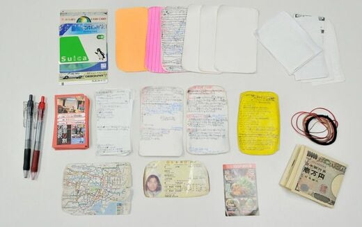 財布には、メモ帳とSuica以外にも、名刺、銀行のキャッシュカード、テレフォンカード、大事な人の電話帳、サービス券、昔のパスポートの切れ端、電車の運行表なども収納されている。キャッシュカードは、今ではレアとなった旧さくら銀行のもの。今でもちゃんと使えるという。