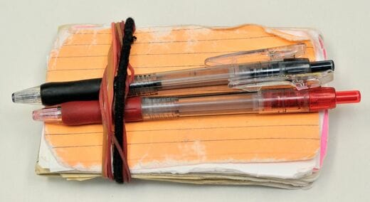 これ以上に独創的な財布は、後にも先にも出てこないかもしれない。のぶき氏が愛用するのは、メモ帳とペンをゴムで束ね、その間に紙幣を挟み込むという無二の“財布”だった。主要な素材は紙で、形状は強いていえば長財布。財布の定義を「おカネを入れて持ち運ぶもの」とするなら、これも立派な財布だ。とても先鋭的な。