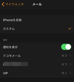 「iPhoneを反映」のままだと、Apple Watchにすべての通知が届いてしまうため、「カスタム」に変更したうえで、必要なメールだけを指定するようにしたい。「VIP」だけをチェックした状態にすると、それ以外のメールは通知されなくなり、重要なメールを逃しづらくなる。筆者の場合、iPhoneではキャリアメールも受信しているため、この通知もオフにした。