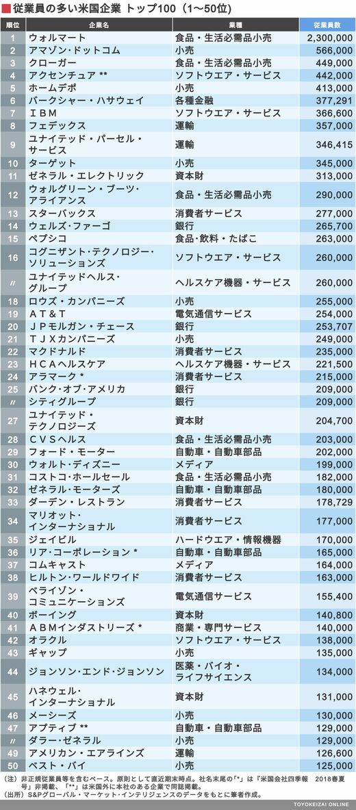 ケタ違い!従業員が多い米国企業トップ100 1位のウォルマートは230万人も雇用している