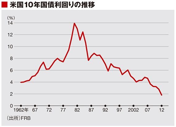 米国10年国債の利回りの推移は、図のとおりだ。1980年代の初めまではほぼ継続的に上昇し、年平均値は81年に13.9%のピークになった。しかし、その後は下落した。とくに80年代後半の下落が顕著だ。91年には7.9%になった。その後もほぼ継続的に低下した。90年代後半に5~6%になり、00年代にはさらに低下し4%台となった。08年からは4%を割り込んでいる。