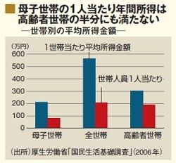 たとえば、貧困率の高い母子家庭。日本政府は、シングルマザーの就労を促進するために、児童扶養手当を5年以上受給してきた母子世帯の手当を最大で5割削減すると決めた(実施は凍結状態)が、母子世帯の母親の85%はすでに働いており、仕事を二つ三つ掛け持ちしているケースも珍しくない。それでも、平均年収は全世帯平均の4割にも満たないのが現実だ(右グラフ)。
