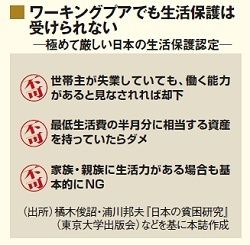 しかも、最低生活水準を下回る収入で生活している世帯のうち、実際に生活保護を受けている人の割合を示す「補足率」は、日本では20%以下と、他の先進国を大幅に下回る。所得がゼロでも働く能力があると見なされたり、最低生活費の半月分に相当する資産を持っていれば却下される、といったように、たとえワーキングプアであっても生活保護が受けられないのが日本なのだ。働けど貧しい日本の貧困層に対するセーフティネットが、完全に欠如している。