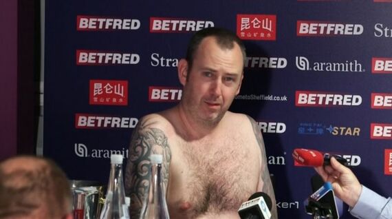 [8日 ロイター] - ビリヤードの一種であるスヌーカーの世界選手権が英国で行われ、3度目の優勝を果たしたウェールズの男性、マーク・ウィリアムズさん(43)が8日、公約どおり試合後の記者会見に裸で臨んだ。