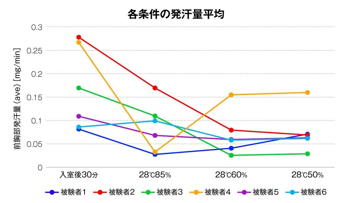 今回の実験により、28度環境下でも、湿度を60%以下に低下させることによって暑さや不快感を減らせること、実際に発汗量も減少することが証明された。