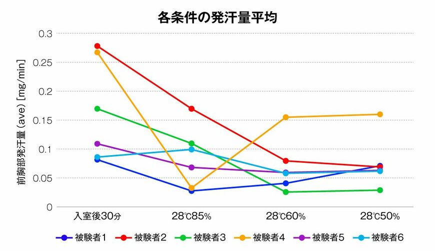 今回は、20代、30~40代、60代の男女各2名ずつ、合計12名を対象として実施。TICにある温度や湿度、気流などを詳細に設定することができる人工気候室を使って、温度を28度に保ち、湿度を85%・60%・50%と設定を変えて変化をみた。被験者には、定期的に軽い体操を行ってもらうなど日常生活に近い状態を作ってもらい、主観的温度感覚、温熱的快適感覚などを確認、さらにサーモグラフィーで体表温度を測り、発汗量なども測定した。