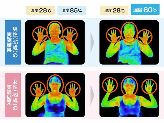 実際に、湿度85%環境では体の表面温度も高く36度程度まで上がり、発汗も多かったが、湿度60%では発汗量も収まった。温度の変化が顕著に出やすいとされる顔や手の表面温度も、通常に近い33度程度まで下がった。湿度を下げることで快適に感じられ、また実際に体の表面温度も低下することが明確に示されたのだ。