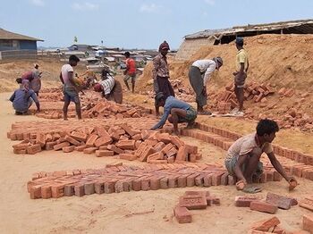 メガキャンプでは斜面を階段状に削り、土のうやシートを敷き詰める大規模な防災工事が急ピッチで進められ、道路のレンガ舗装、側溝の整備、無数にある竹橋の補強なども行われている。もちろん重機がフル稼働しているが、大部分はロヒンギャの男性たちによる人力作業であり、小高い丘から見渡すと、戦国時代の築城や陣地の普請はこんな感じではなかったかと思わせる“スペクタクル”が広がっている。