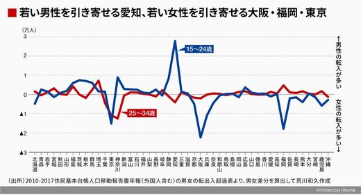 東京への人口一極集中が止まりません。総務省が毎年公表している住民基本台帳人口移動報告によれば、2017年の人口転入超過人数は東京が約7万5000人(日本人のみ)と圧倒的です。では、未婚男女の人口移動はどうなっているのでしょうか?