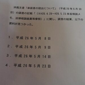 いや、「あるはずの資料がない」という点がこの問題の本質といえるのかもしれない。2014年6月30日の決裁文書「承諾書の提出について」を作成する際の資料となった本省相談メモ、法律相談結果などのうち、なぜか2014年4月28日分がすっぽり抜けていたのだ。