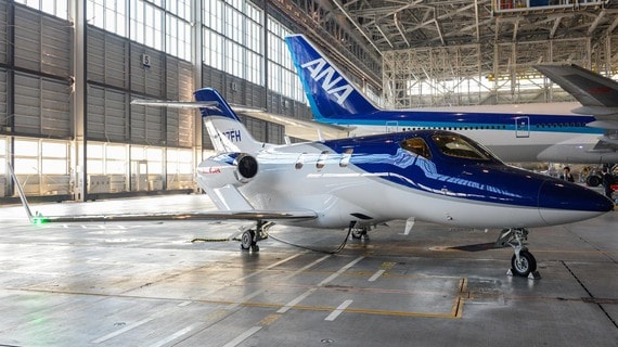 活用を促そうと、ANAホールディングスは今夏、双日との合弁でビジネスジェットのチャーター手配事業を始める。「ANAが長年培ってきた法人販売網が力を発揮する」(片野坂真哉社長)。まずは米欧におけるANAの国際線からの乗り継ぎ便チャーターで実績を積み、日本からの国際線利用も増やしたい考えだ。ここで活用するのがホンダジェット(上写真)。ホンダが開発した4〜6席の小型ビジネスジェット機で、米国内の短距離便などに適している。