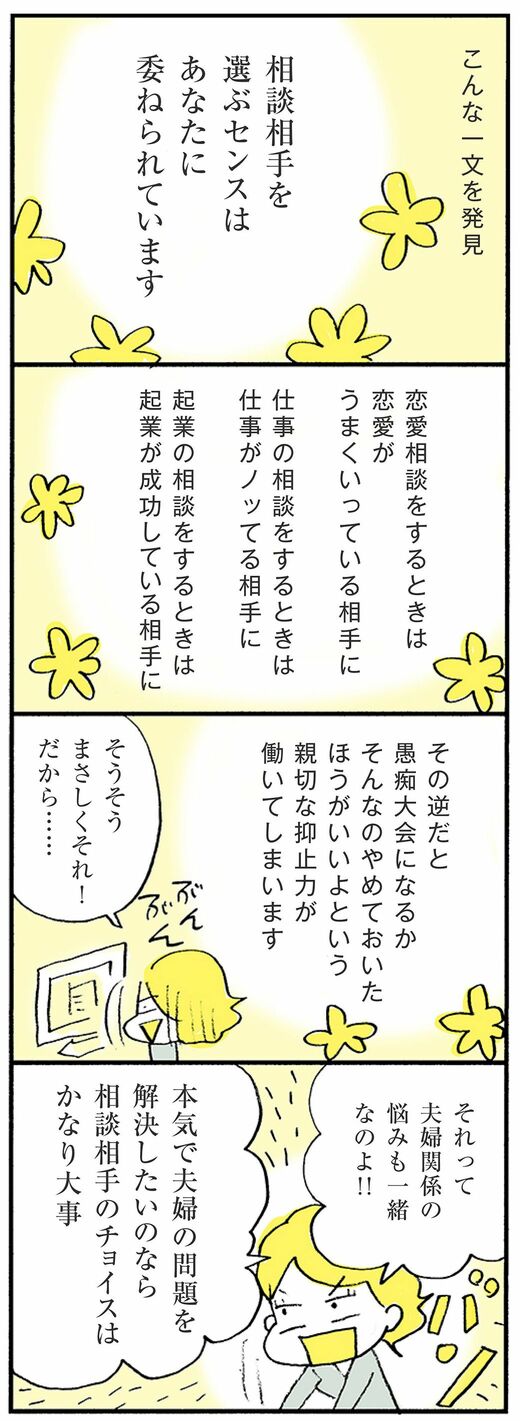 ライフ #ほしいのは「つかれない家族」 前の記事 次の記事 悩み相談の相手を間違うと「底なし沼」になる 誰を選ぶか、あなたのセンスにかかっている 2分で読める 公開日時:2018/06/01 06:00 ハラユキ イラストレーター、コミックエッセイスト フォロー 1/6 PAGES 2/6 PAGES 3/6 PAGES 相談相手を選ぶセンス 次ページが続きます:【夫婦関係がうまくいっている人に相談すると】 4/6 PAGES 5/6 PAGES 6/6 PAGES