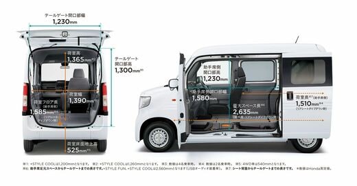 助手席側にはボディの上下をつなぐピラーがなく、助手席と後席のスライドドアを全開にすると幅1580×高さ1230mmの大開口部を実現できる。助手席ピラーレスはダイハツ「タント」など軽乗用車で先行している構造だが、軽商用バンとしてはN-VANが初採用となる。テールゲートと併せて使うことで、荷物の積み降ろしが従来の軽商用バンよりもやりやすくなりそうだ。