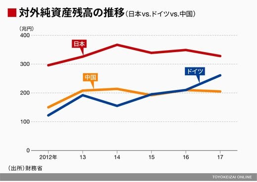 日本と比較した場合はよりドイツの優位が鮮明であり、2011年以降、7年連続でドイツの経常黒字が日本のそれを凌駕しており、しかもその差は常に1000~2000億ドルと大きい。このような経常収支に基づく「フロー」の差は自ずと「ストック」である対外純資産の差へとつながる。実際にドイツの対外純資産残高の増加は著しいものがある。