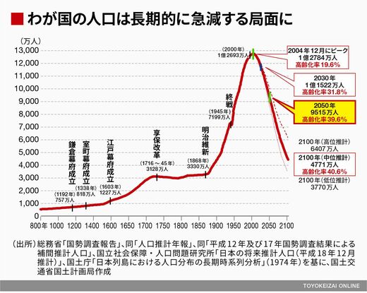 1700年ごろからほぼ一定であった総人口が、明治維新以降は急激に増加し、2004年にピークを迎えてから少子化によって減少が始まっている。江戸時代に鎖国していて国土からの食糧の生産の制限もあって総人口が頭打ちだった日本が、明治維新以降は西洋の科学技術を取り入れて経済成長をするにつれて総人口が急増した。