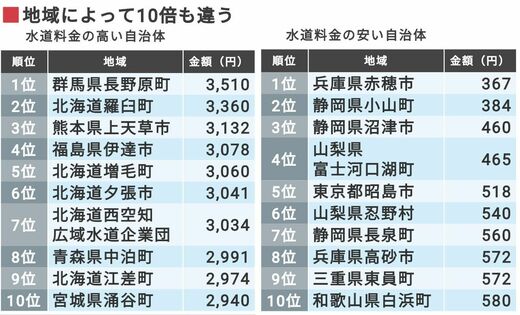 実は、水道料金は地域によって10倍近い差がある。豊かな水源や水利権を抱えていたり、効率的な送配水ができる自治体は安価に水を提供できる一方、維持・更新費がかさんだり、 水利権を持たず広域企業団(複数の自治体が設立した公営企業)から水を購入している自治体は、料金が高くなる。