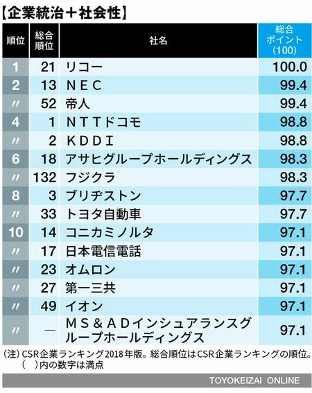 企業統治+社会性は4年連続でリコー(同21位)。「生活の質の向上」「脱炭素社会の実現」「循環型社会の実現」といったマテリアリティを掲げ、高いレベルのガバナンス、社会課題解決に貢献。インドでのプロジェクターを活用した学校での質の改善、南アフリカで教育・図書館事業を行うNGOへのプリンタ支援などグローバルでの課題解決に取り組んでいる。