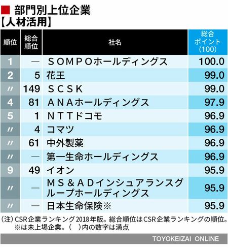 評価項目の各部門トップは、人材活用がSOMPOホールディングス。女性が過半数を占める職場で育児休業の取得や女性管理職登用を積極的に推進。残業時間が月9.0時間と低いレベルで男女問わず働きやすい環境が整っている。