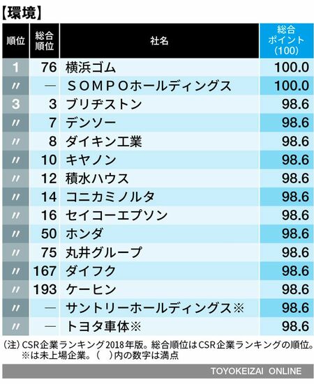 環境部門は横浜ゴム(総合76位)とSOMPOホールディングス。横浜ゴムは環境保護推進室を中心に幅広い環境取り組みを実施。事業活動での環境事故など幅広くリスクを把握し、緊急事態を想定した訓練も行っている。再生可能エネルギーも太陽光、風力などを活用。自社グループのバリューチェーン全体でのCO2総量を2050年度に2005年度比50%減といった長期計画を掲げ、単年度の目標にも落とし込み着実に取り組んでいる。