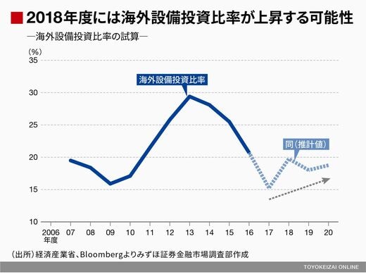 この点を考慮すれば、海外売上高が増加しているのにもかかわらず現地法人の設備投資が増えていない背景には、2012年度以降、円安が進んだことによって日本企業が国内の設備投資を重視していたとも考えられる。そして、すでに円安トレンドは終わっており、今後もドル円相場に2年程度遅れる形で「海外設備投資比率」が連動していくのであれば、2018年度に「海外設備投資比率」は上昇に転じる可能性がある。